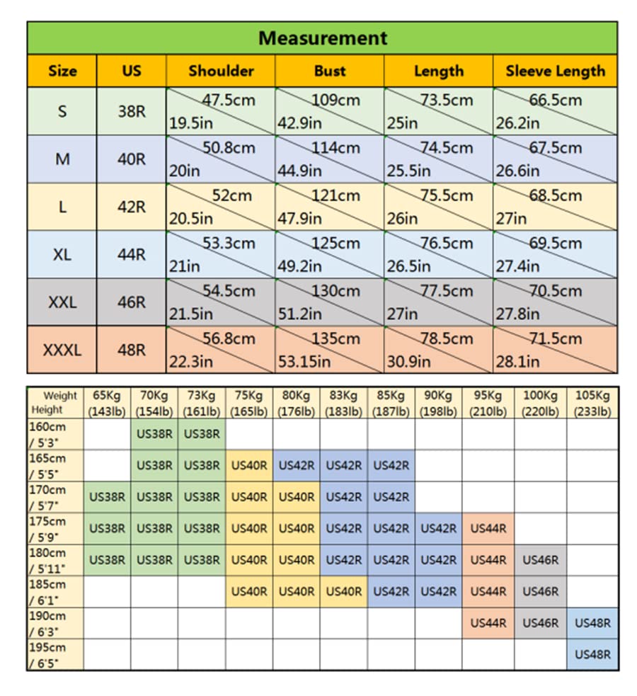 - Size reference: S≈38R, M≈40R, L≈42R, XL≈44R, XXL≈46R, 3XL≈48R
