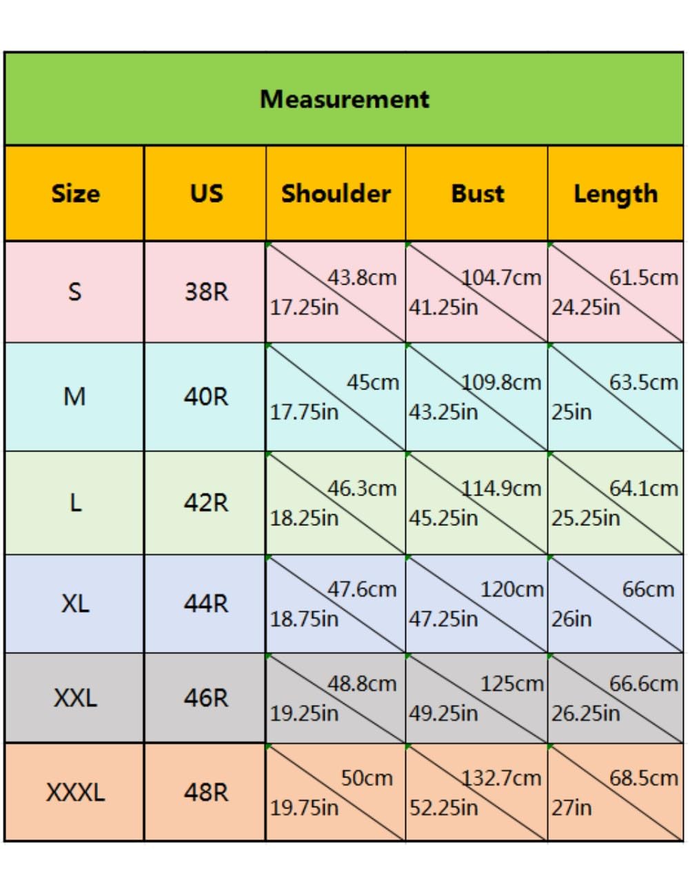 - Size reference: S≈38R, M≈40R, L≈42R, XL≈44R, XXL≈46R, 3XL≈48R